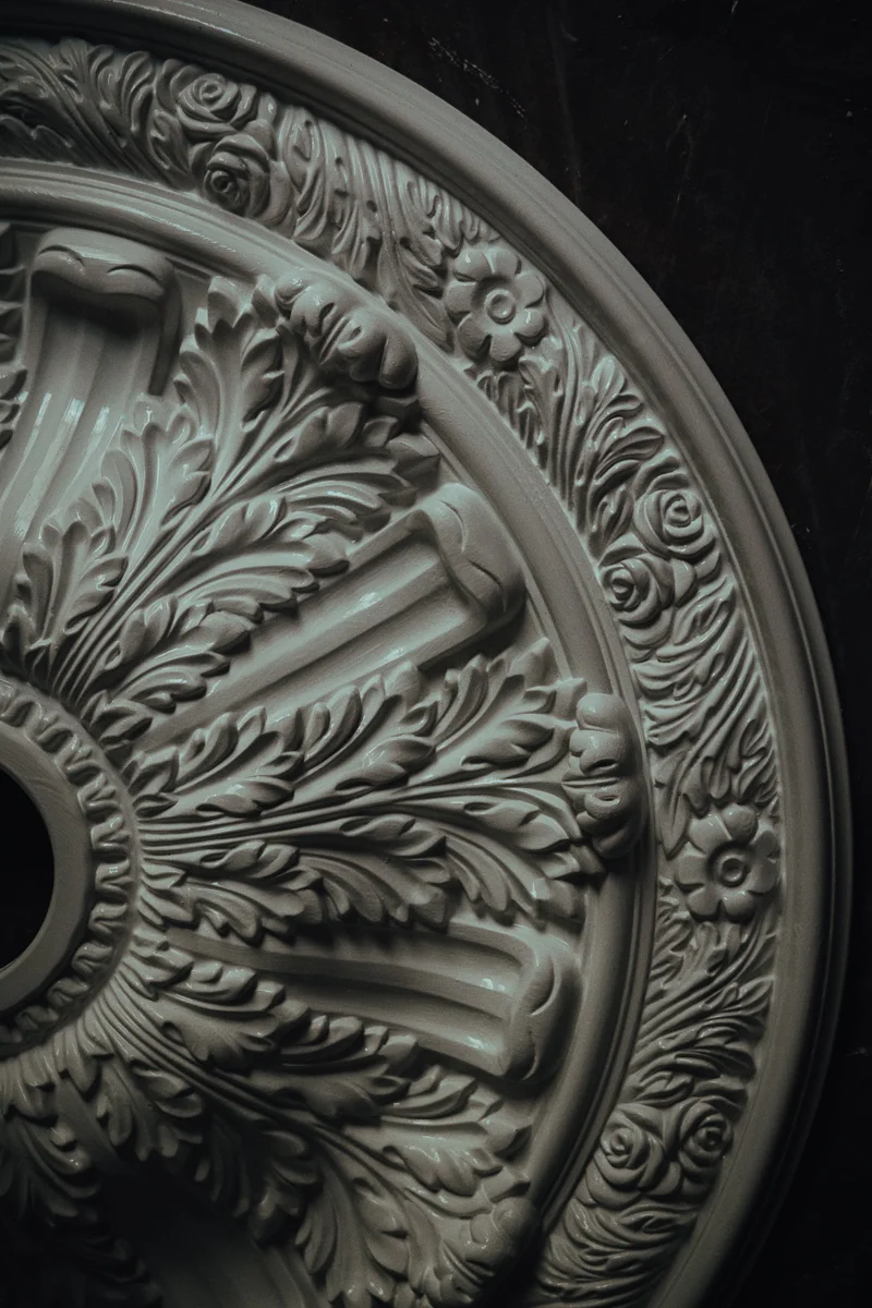 Next week we'll be installing a border of molding on the ceiling kind of like this, but minus the appliques, as well as crown molding.